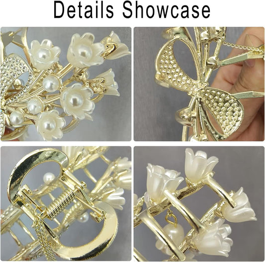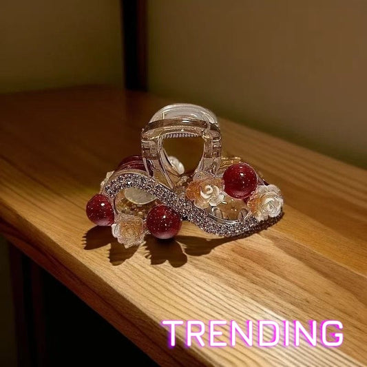 Embellished Pearl and Floral Hair Claw - Red Accents Elegant Pearl and Crystal Hair Claw Glamorous Gold and Pearl Rhinestone Hair Claw