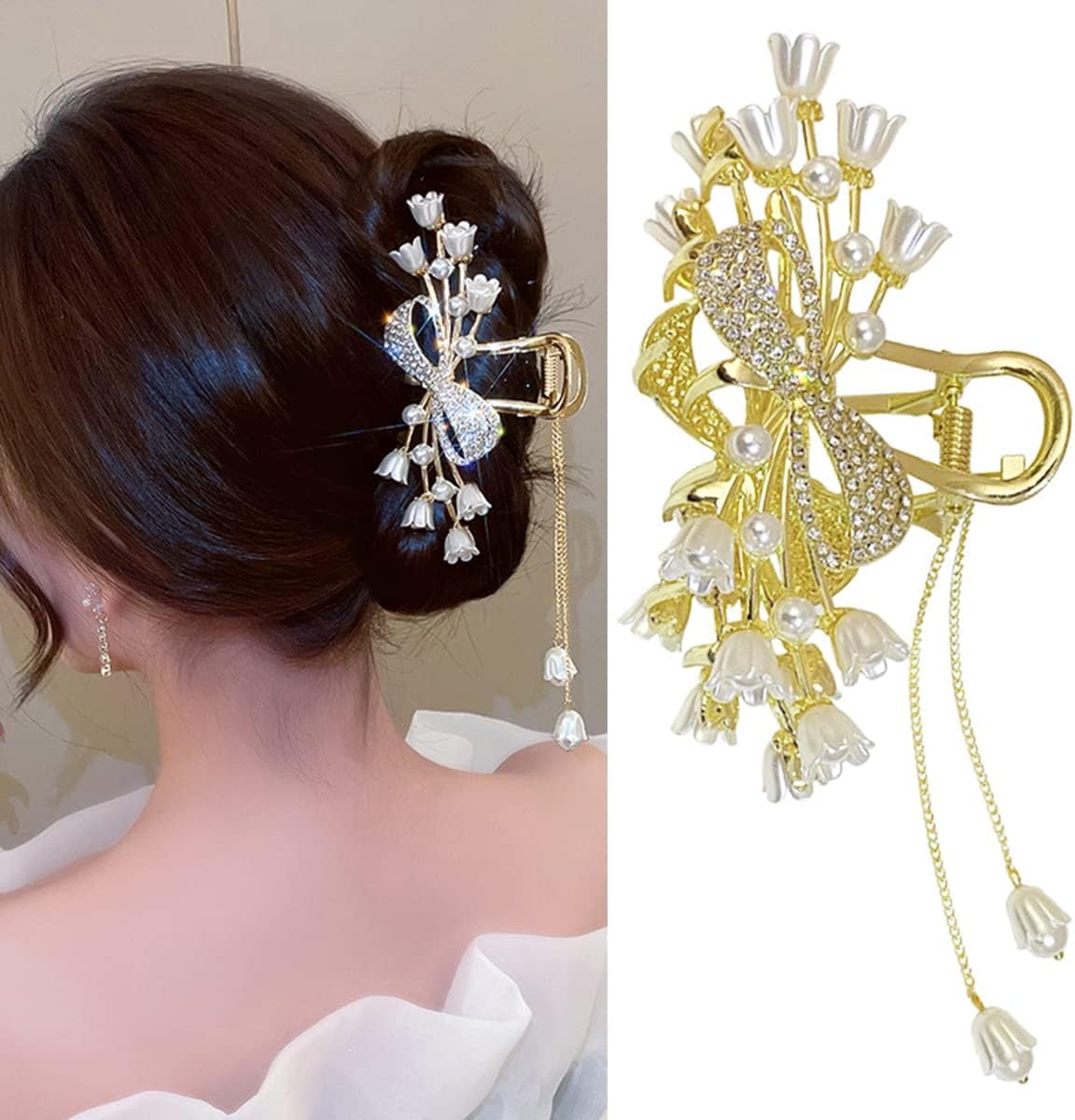 Delicate butterfly-shaped hair accessory with faux pearls, white flowers, and sparkling rhinestones, perfect for adding a touch of elegance to any hairstyle or outfit