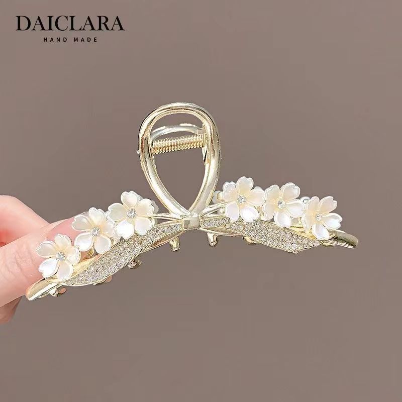Elegant gold-tone hair clip featuring white floral embellishments and rhinestones, ideal for weddings and special events.