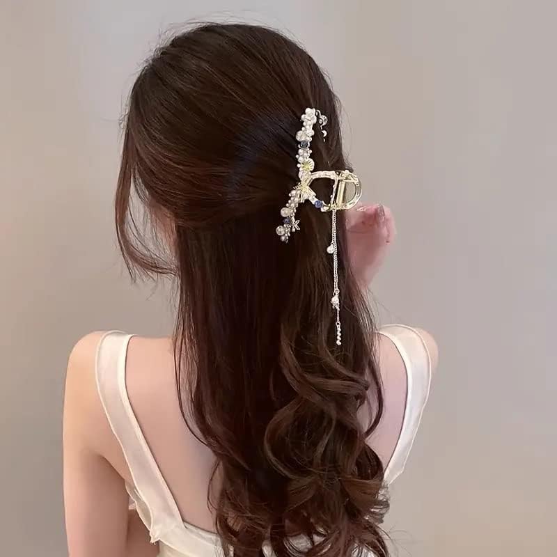 Starvis Exquisite Shiny Crystal Pearl Tassel Sea Hair Clip Claw For Women Bun Clip Ponytail Holder Buckle Hairpin Hair Accessories Women Ponytail Tail Hair Bun Holder Claw Bun holder